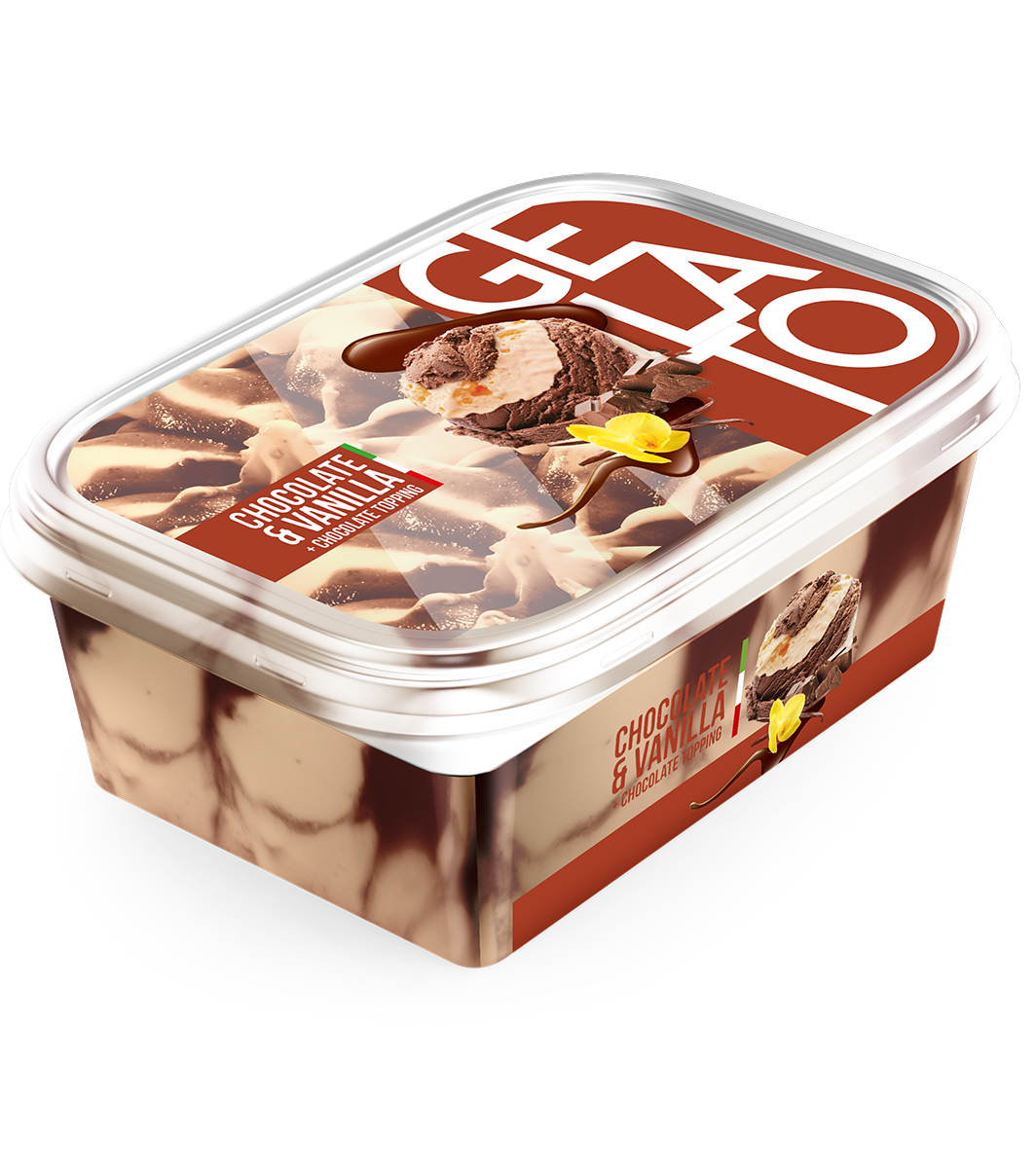 Сладолед со вкус на млеко, збогатен со прелив со вкус на какао, декориран со мрвици од чоколаден супститут.