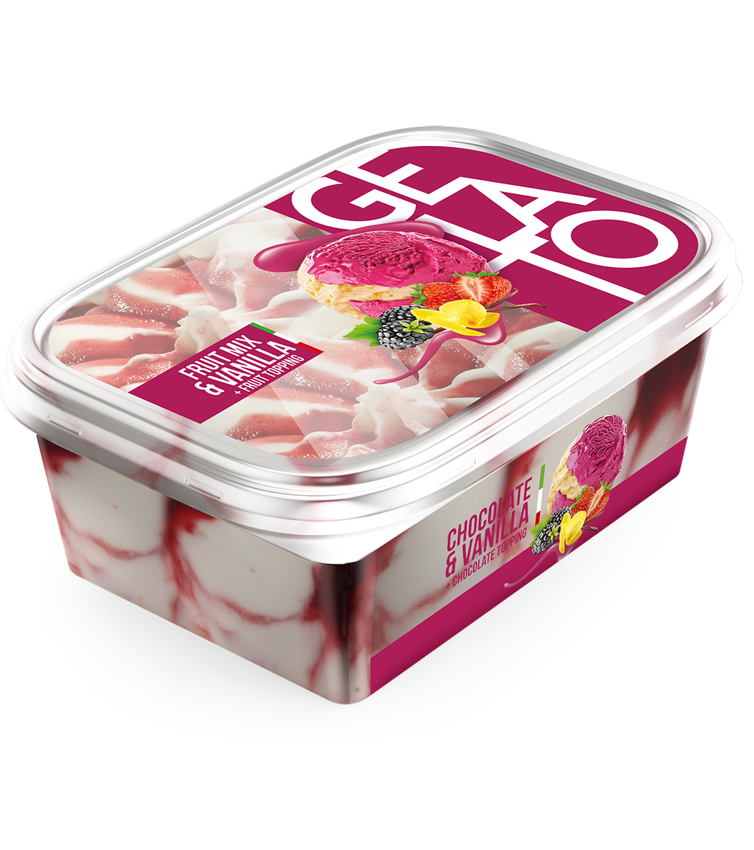 Сладолед со вкус на ванила и шумско овошје, збогатен со прелив со вкус на шумско овошје.